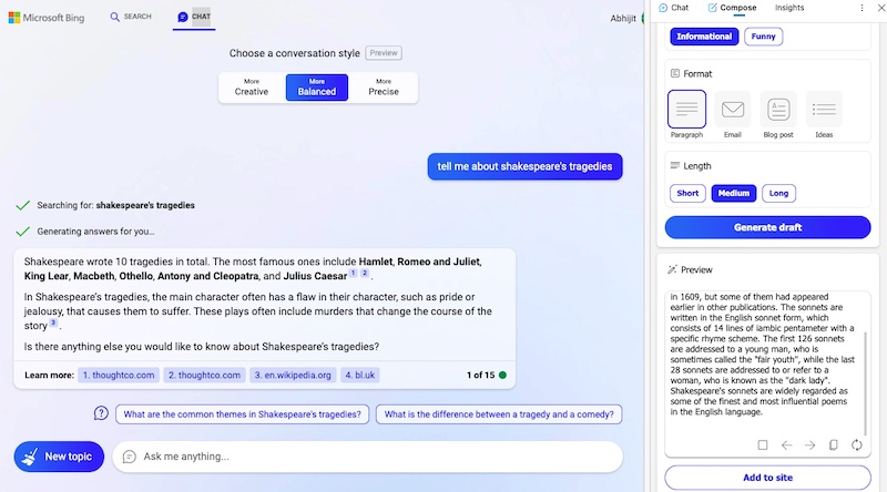 Bing, however, makes the interaction more personal by directly addressing the user as “you”. (“What would you like to know more about Shakespeare?”)